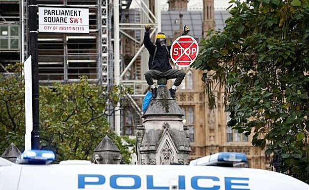 Ecologistas que han bloqueado calles y transportes en Londres desde hace diez días se sentaban en grupos de diez en Trafalgar Square para debatir en asambleas ciudadanas las grandes cuestiones del mundo, pero en el Parlamento el presidente del Comité del 'brexit', Hilary Benn, no lograba que su ministro, Stephen Barclay, le dijera explícitamente que el Gobierno enviará una carta a Bruselas solicitando una extensión si Reino Unido se enfrenta el sábado a una marcha de la Unión Europea sin acuerdo.