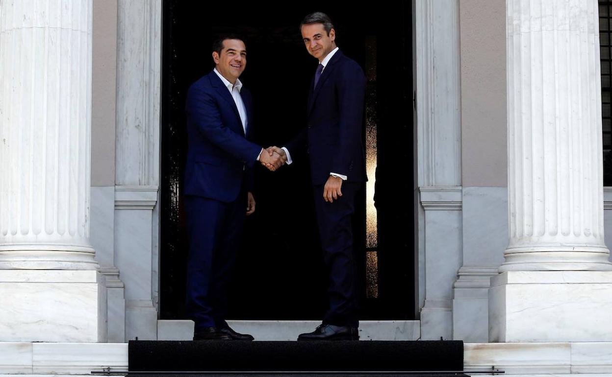 Alexis Tsipras recibe a Kyriakos Mitsotakis, ganador de las elecciones generales, a las puertas de la Mansión Máximos, residencia oficial del primer ministro. EFE