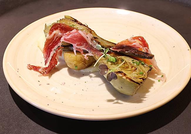 «Tengo las mejores alcachofas del mundo». Eso es lo que le dijo el hortelano tudelano Juan Burgos al cocinero Paul Ibarra cuando éste se puso al frente de Los Fueros. Desde entonces el navarro ha sido el proveedor de referencia de una casa histórica que ha hecho de las verduras de temporada una de sus señas de identidad. Un as en la manga que Ibarra aprovecha cada año de formas distintas, para mantener al público siempre expectante. Esta vez sirve las alcachofas frescas de Tudela que le trae Juan con un caldo dashi al que ha ido añadiendo garbanzos, panceta, tocino y torreznos triturados para obtener un punto de «sabor a cerdito, pero fino». Remata la jugada con un aliño de cebollino y unas láminas de katsuobushi que dejan embobado al comensal. Él, mientras tanto, ya está pensando en los espárragos o en los guisantitos lágrima que están al caer.