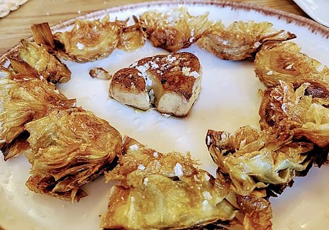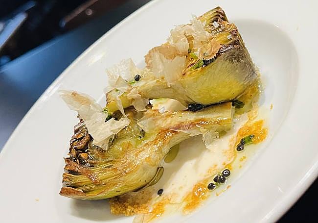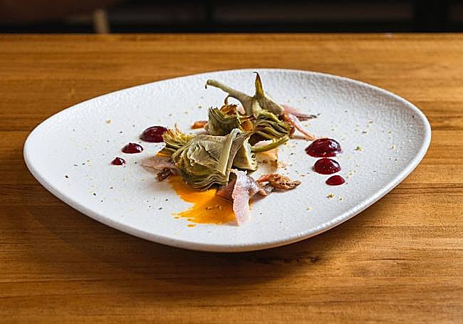 Otros que tiran de combinación ganadora –alcachofa mas ibérico– son Javier Sancet y Andrés Lucía, en este caso porque está en el acta fundacional de su restaurante. Navarro y extremeño unieron fuerzas en 2020 para abrir un restaurante en 'Sanfran' donde todos los platos llevan algo de una y otra tierra. Las alcachofas nunca faltan en su mesa –si no es temporada tiran de una conserva superior– con un plato que lleva panceta ibérica asada y chutney de mango. Pero en estas fechas incluyen fuera de carta una propuesta más arriesgada si cabe, al mezclar las alcachofas con manteca colorá, anchoas del Cantábrico y torreznitos. Una bomba de sabores marca de la casa que no deja indiferente.
