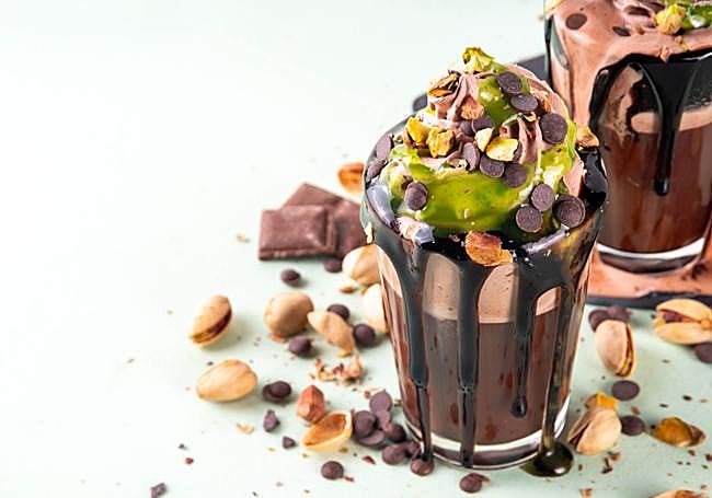 Esa es la clave del chocolate Dubái. Que lleve mucho pistacho. Por el sabor, por la textura, por el crujiente y por el color. Se utiliza la crema de pistacho en la elaboración y, ni qué decir tiene, hay que buscarla con el mayor porcentaje posible del popular fruto seco. Recordemos que los pistachos aportan su buena cantidad de proteínas vegetales y mucha fibra, además de grasas de las llamadas buenas y antioxidantes. Apenas suma hidratos de carbono y son ricos en hierro y potasio. Existen modalidades de helados con sabor a chocolate Dubái.
