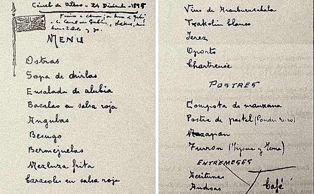 Pero veamos ya de qué constó el famoso menú: de entremeses aceitunas y anchoas, y como platos principales ostras, sopa de chirlas, ensalada de alubias, bacalao en salsa roja o a la vizcaína, angulas, besugo, bermejuelas, merluza frita y caracoles en salsa roja. De postre compota de manzana, pastel de ponche suizo, mazapanes y turrón de Jijona y yema, todo regado por vino de Aranburuzabala -suponemos que elaborado por la familia de su amigo Juan-, txakoli blanco, jerez, oporto, licor chartreuse y café. Una cena opípara que cumplía con los preceptos de abstinencia de carnes que entonces aún regían la víspera de Navidad.