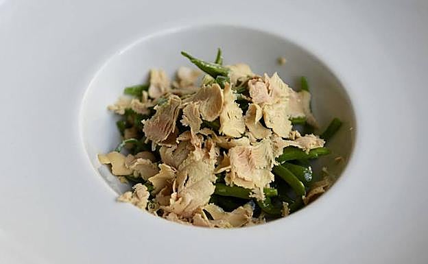Comienza con sardina marinada, de sabor intenso, cuyos lomos se salan y se ponen en aceite navarro de arbequina La Maja, con un toque frutado. Encima llevan un concasse de tomate y cebolleta que aporta frescor al plato. El menú continúa con un plato clásico: ensalada de vainas cortadas longitudinalmente que se escaldan, se saltean con ajo y se ponen sobre un jugo de caldo de cocido, que le da un sabor muy rico. Sobre las vainas, al dente, se disponen unas lascas de foie.