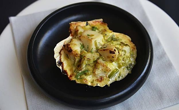 En el fondo de la concha va una base de puerro y cebolla con mantequilla y crema. En el último momento se echa la vieira laminada y se gratina.
