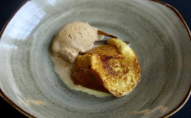 Y a la hora del postre, una magnífica torrija de pan brioche. El pan de Roberto Fernández (panadería Crosta de Zalla) se infusiona con leche, cáscaras de limón y naranja, canela y yemas de huevo. Tras bañarlo en esta infusión, se carameliza con azúcar y una nuez de mantequilla y se marca en la sartén. Se acompaña con un helado de avellana.