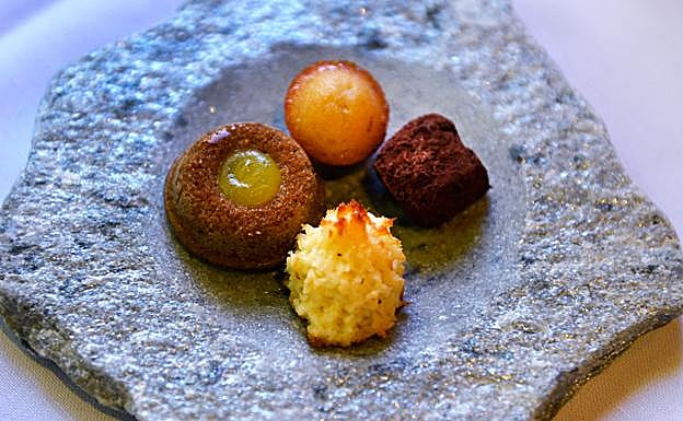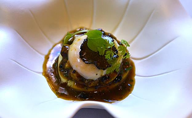 El menú que ofrecen jueves, viernes y sábados por la noche -38 euros, bebidas no incluidas-, es magnífico. El festín comienza con una vichyssoise caliente de puerros ideal para los días fríos para continuar con bombón de foie y txakoli Urezti vendimia tardía -elaborado en Gernika- con cubierta de palomitas y pan de chocolate y especias, uno de los platos clásicos del Boroa. Les siguen unos moluscos y crustáceos al vapor sobre guacamole con gelé de tomate -plato sutil y delicado-, un untuoso huevo a baja temperatura con patata rota, hongos y jugo trufado, que es un valor seguro, y bacalao al pilpil con sus callos a la vizcaína.