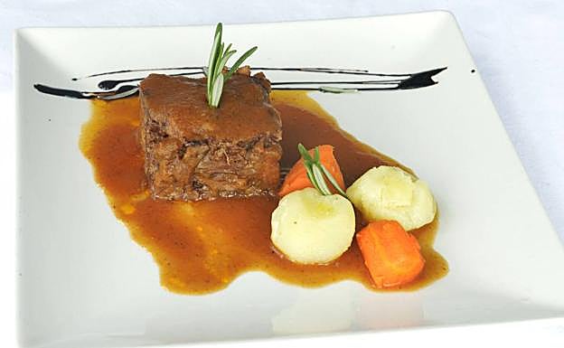 El menú prosigue –no se van a quedar con hambre, las cantidades son generosas– con rabo de vaca en salsa, guisado al modo clásico, con verduras y un chorretón de un buen vino tinto de crianza. Una vez cocinado con mucho tiempo y paciencia, se desmiga la carne y se presenta en la mesa con patatas baby y zanahoria.