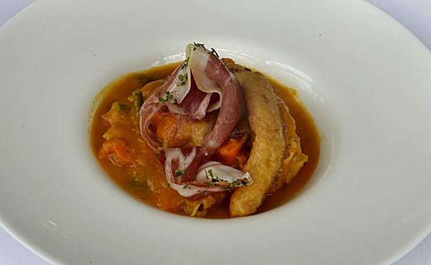 El festín gastronómico comienza con unos raviolis de calabacín rellenos de boletus con salsa de pistachos, plato muy suave y delicado. Continúa con una menestra de verdura, cuya base es una salsa elaborada como dios manda –cebolla, ajo, zanahoria y tomate maduro y trabajada durante mucho tiempo–. Se le añaden espárragos, habitas y ajos tiernos, algunas verduras rebozadas (pencas, calabacín o alcachofas) y unas lascas de jamón ibérico. Le sigue lomo de merluza con un leve toque de brasa, patata y cebolla caramelizada, que se acompaña con un crujiente de cebolla, pimientos rojos pelados y asados y una flor con sabor a ajo.