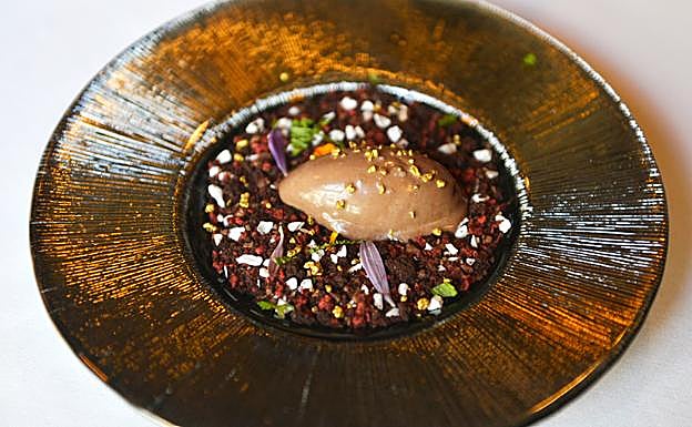 El menú que nos ofrece Ricardo consiste en platos, todos ellos de la carta del Yandiola, como rulo crocante de steak tartar yodado –con este bocado el bar The Boar, ubicado en la planta baja del Azkuna Zentroa, gestionado por el grupo Yandiola, acaba de ganar la IV Edición del certamen gastronómico Bilbokatessen organizado por San Miguel–, unas sabrosas y delicadas alcachofas pasadas por la brasa con jugo de cebolla morada de Zalla, arroz meloso de crustáceos, que tiene un sabor intenso, y raviolis de pichón, hongos, salvia y queso trufado, una exquisitez sorprende al comensal. Como postre, arenas de cacao, chocolate, praliné y cítricos, que no deben perderse por nada del mundo.