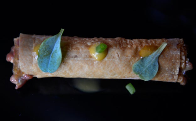 Pasta filo, solomillo picado, mertensia, acedera, banana de playa y hierba de rocío...