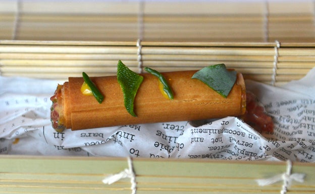 Canutillo de pasta filo relleno de carne de solomillo picada y aderezada con pepinillo, alcaparras, salsa curry, mostaza, anchoas, yemas y claras de huevo.