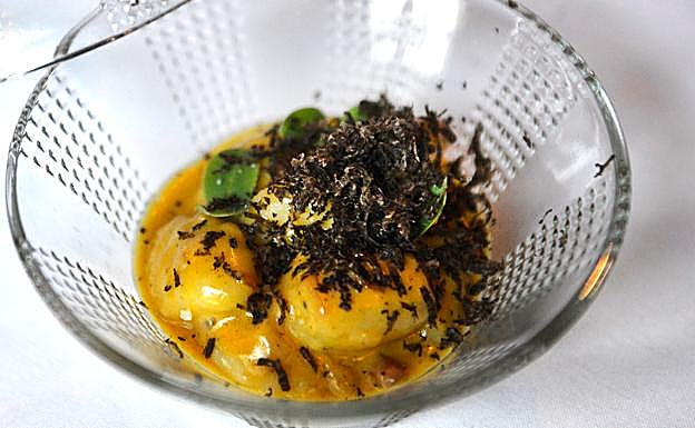Los ñoquis de patata se terminan de cocer en salsa carbonara, que lleva un fondo de cebolla, bacón ahumado, crema de leche, huevo y queso trufado.