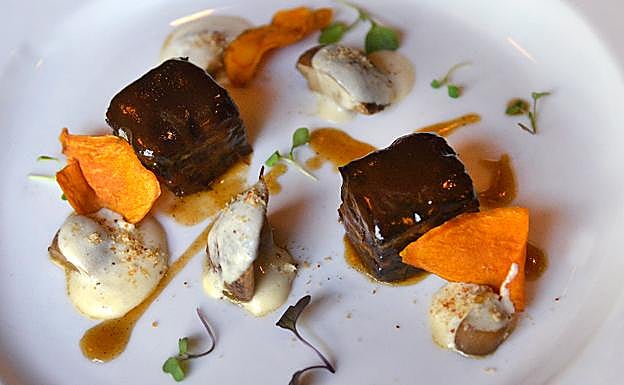 Se estofa y se glasea en horno con su propio jugo. Se presenta con un guisado de hongos, hierbas aromáticas, tomillo y romero, y chips de boniato.