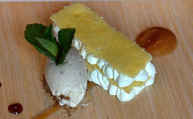 Milhojas de láminas crujientes de queso Idiazabal ahumado y un mousse de queso fresco con un dulce membrillo y helado de nueces.