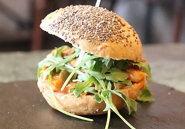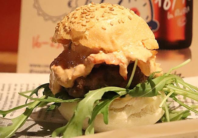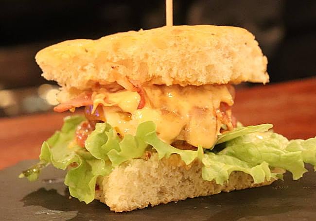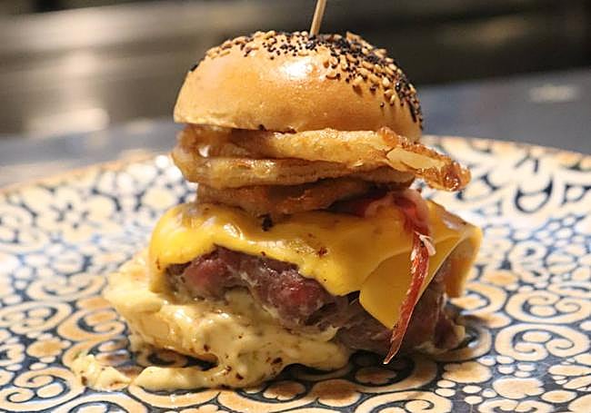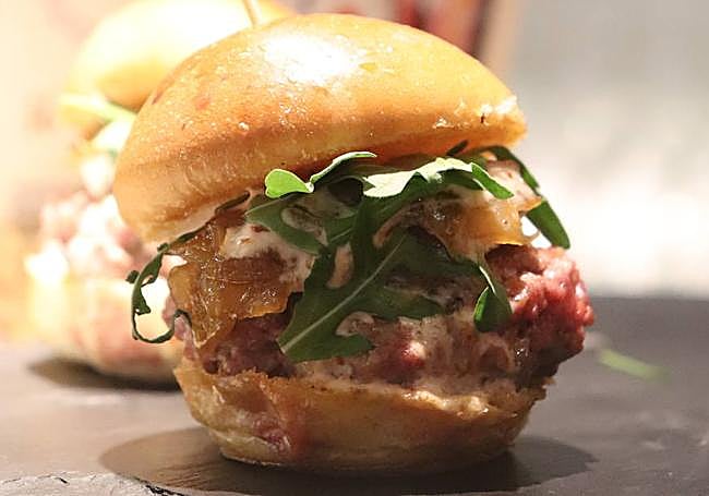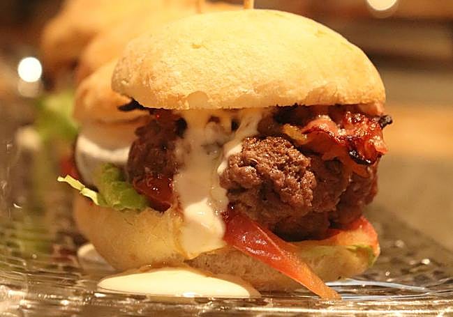 La 'Miniburgurisipil' es una burger con cebolla caramelizada , lechuga, tomate, beicon y un toque picante con pan focaccia.