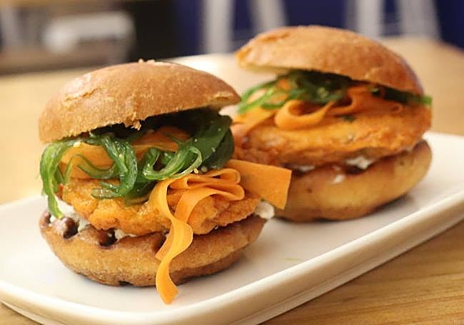 Mini-burger de merluza con ensalada de zanahoria y algas.