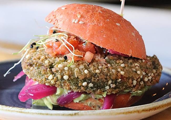 Hamburguesa vegana con humus casero, calabacín, cebolla roja y alga wakame.