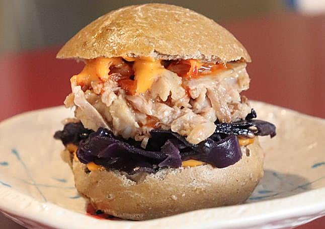 Mini-hamburguesa de pollo braseado con verduras salteadas, rúcula, salsa ponzu y barbacoa.
