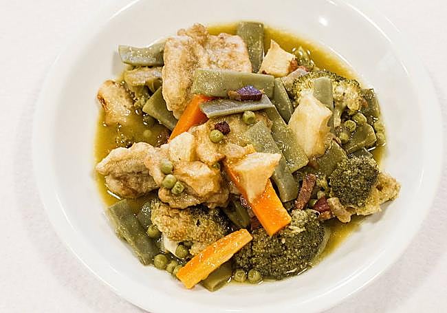 «Por separado cocer las verduras (alcachofas, espárragos, guisantes, habas, zanahorias, etc.). Freír patatas partidas en cuadritos. Estofar en aceite y vino blanco una cebolla partida en ruedas delgaditas. Minutos antes de sacarlo a la mesa se une todo y se guisa para servirlo bien caliente».