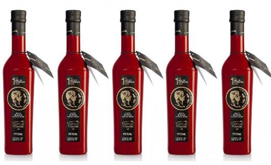Botella de medio litro de aceite Castillo de Canena Primer día de cosecha. Variedad Picual procedente de olivos plantados en Canena (Jaén). La etiqueta cambia cada año; en esta cosecha la firma el escritor Juan Eslava Galán. Precio: 23 €.