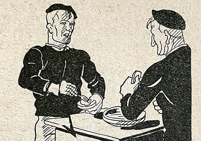 El recetario postal incluyó instrucciones para hacer casi todas las recetas vascas célebres, desde las angulas hasta el bacalao a la vizcaína, al pil-pil y en salsa verde, pasando por el salda garbia o caldo limpio, la porrusalda, la menestra bilbaína, los txipirones o el besugo asado. Ilustrado con preciosos dibujos del pintor de origen guipuzcoano Pedro Antequera Azpiri (1892-1975), lo más curioso de este folleto no está en sus recetas, sino en el epílogo del primer tomo. Es ahí donde viene un largo texto, obra de autor anónimo, en el que se habla de Chinostra, El Amparo y otros viejos templos de los gourmets bilbaínos «para quienes el comer tiene cierto carácter religioso y sagrado, con sus ritos y ceremonial, del que se excluye toda parte espectacular y no nutritiva». También se menciona al mercado de La Ribera, en el que al contrario de otras ciudades era habitual ver a hombres haciendo la compra y en el que según el cronista se instaló el primer teléfono de Bilbao. ¿No les parece un dato maravilloso? Voy a intentar contrastarlo para la próxima semana.