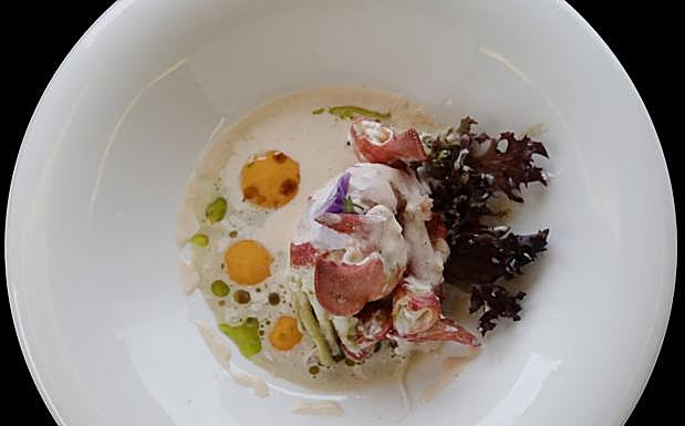Ingredientes: Un bogavante de unos 650 gramos, patata parmentine, lechuga y emulsión de tomate y emulsión de los corales del marisco.
