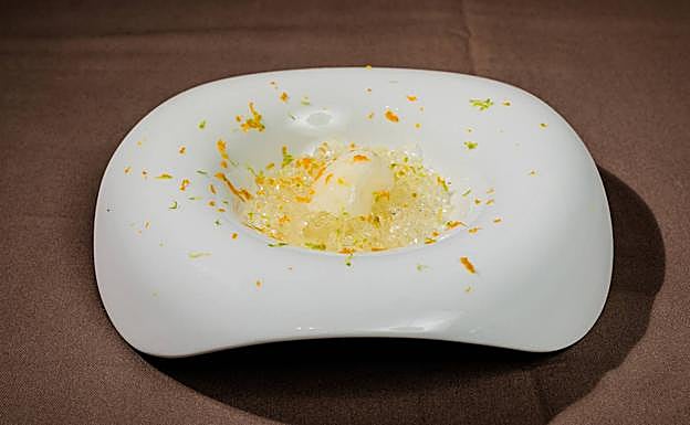 Receta de gelatina de gin-tonic, sorbete de limón, caramelo de limón y enebro y ralladura de naranja y lima para Navidad de Mikel Fiestras, de La Regadera (Vitoria)