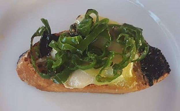 Sobre una rebanada de pan tostada se dispone la kokotxa de bacalao al pilpil, previamente macerada en aceite de oliva, ajo y guindilla. Una vez el aceite esté tibio se coloca la kokotxa y se liga su pipil siguiendo el método tradicional. Sobre kokotxa se pone un pimiento de Gernika cortado en juliana y salteado en aceite de oliva. Se aliña con una reducción de Módena y se le añade un toque de sal Maldón.