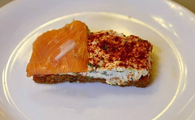 Sobre una tosta de pan de molde, que se fríe en la sartén con aceite de oliva, se pone la ensaladilla, elaborada con lechuga, cortada en juliana, txaka y huevo cocido, muy bien picados. Todo ello se liga con mahonesa. Por encima se espolvorea pimentón ligeramente picante. Cubriendo parte de la ensaladilla se coloca una loncha de salmón, que lleva por encima cebollita picada en juliana. Se termina con unas gotas de limón.