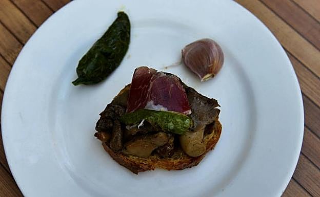 Las setas, hongos y champiñones se maceran con ajos y se sofríen en aceite de oliva con los propios ajos, que se retiran inmediatamente. Cuando las setas, hongos y txampis están a media cocción se les echa jamón bien picado y unas gotas de txakoli. Se presentan sobre una rebanada de pan tostado. Por encima lleva unas tiras de pimiento verde del país y jamón, que se tuesta con el propio calor de las setas.