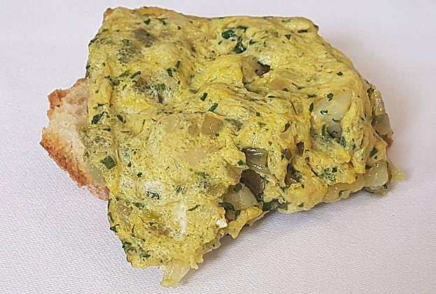Se pocha abundante cebolla –que debe quedar trasparente–, mucho pimiento verde, una cucharada de perejil y el bacalao, que previamente se ha desmigado. Todo ello se saltea y se mezcla con los huevos, batidos con anterioridad. La operación concluye pasando los ingredientes por la sartén, apenas vuelta y vuelta, para que de esta manera la tortilla quede melosa y muy jugosa.