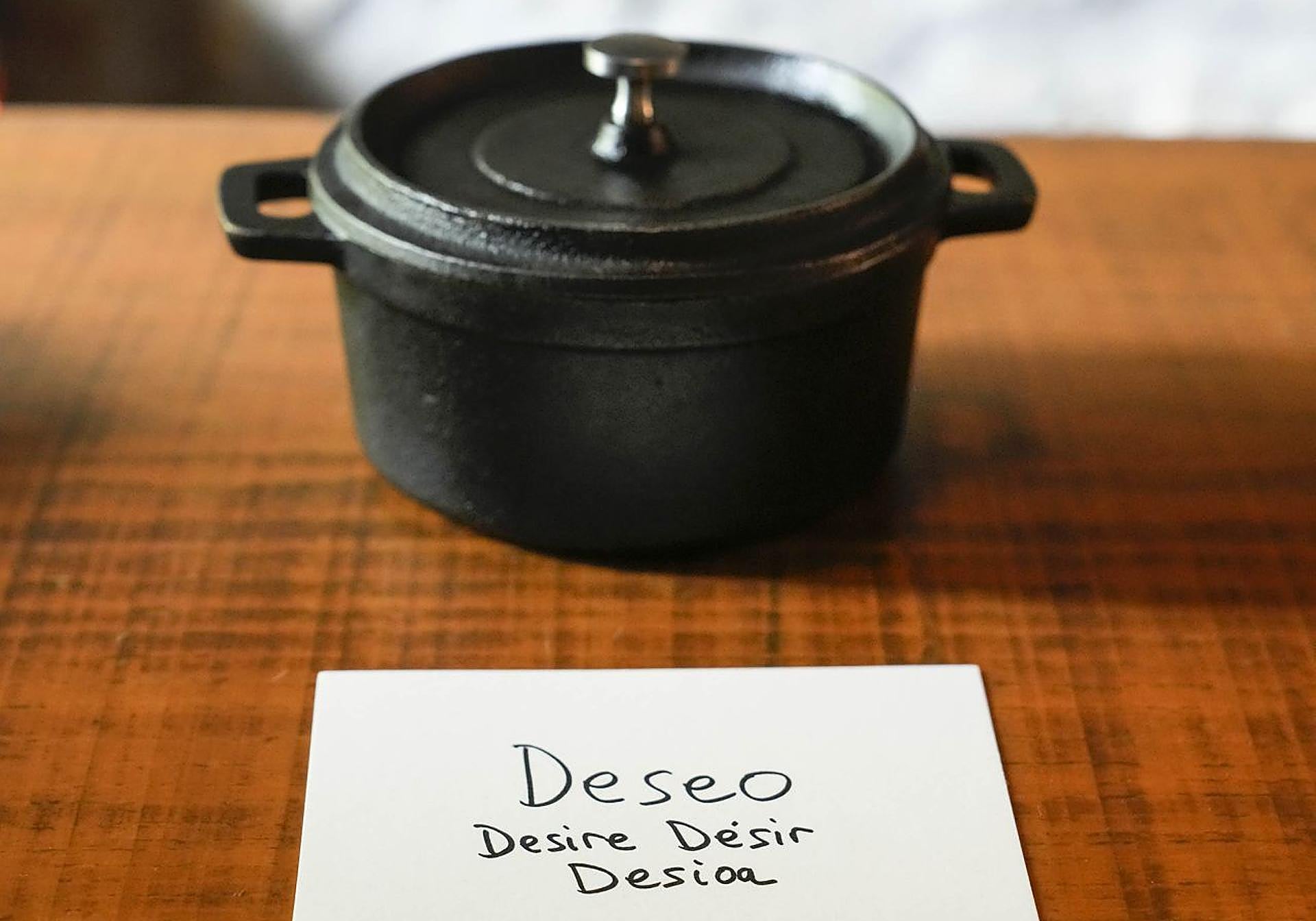 Los nombres de los platos son una categoría en sí mismos. Jardín de amaranto, Contesa: traiciones de la memoria, Matrioska de puerro, Besar. Al inicio hubo uno de chupar llamado Todo me recuerda a ti. Envueltos en papel cebolla se entregan al comensal junto al enunciado de los vinos en un kit, con las manos del equipo en cubierta, que sale del magín de Sasha Correa.