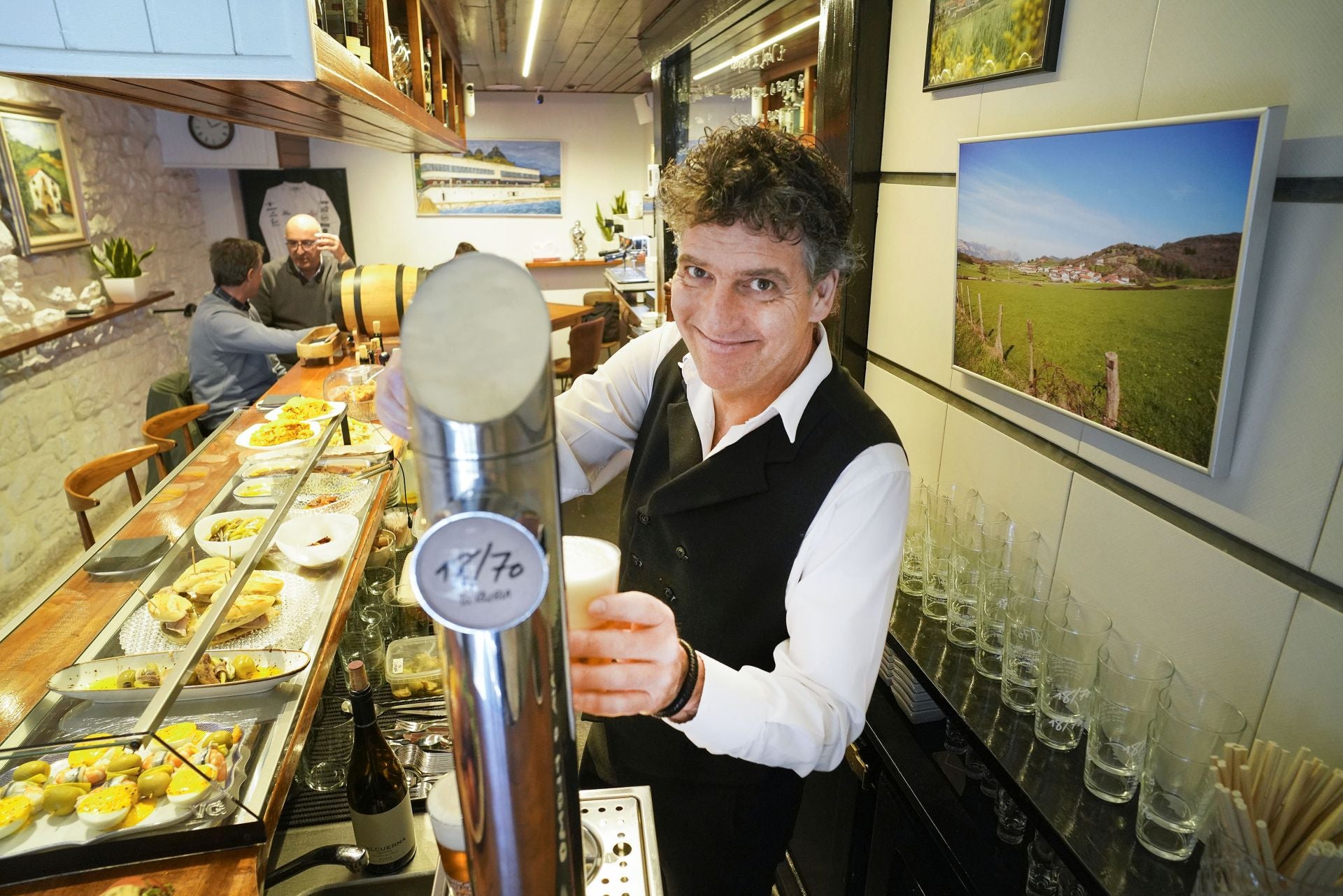 Uno de los grandes aciertos del Ibai es haber mantenido intacta su alma de taberna. Así, mientras en el comedor se ofrecen festines de muchos quilates a un público global, en el bar de la entrada los clientes autóctonos dan cuenta de una humilde gilda o unas anchoitas mientras riegan el gaznate con una copita de txakoli. Tras la barra, Atxen Gurutzeta.
