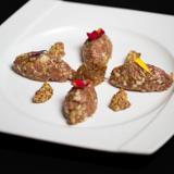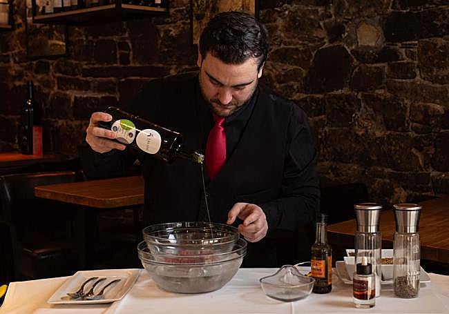 Mikel García prepara en la sala de Las Lías un steak tartar al momento, según le enseñó a hacerlo en El Serbal santanderino su jefe, «y amigo hasta la muerte», Rafael Prieto.