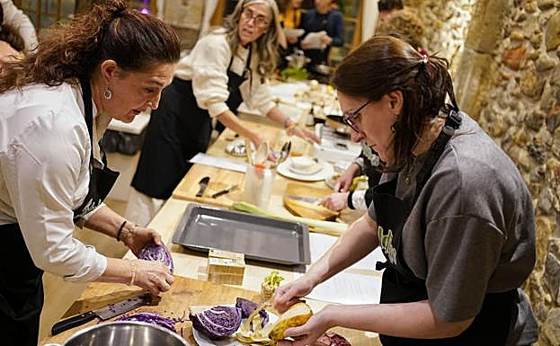 Sobre las mesas de su último taller, colores y más colores, como una decoración navideña de lo más natural. Los colores de la lombarda –se puede hablar mucho de esta verdura que en su interior lleva todo un paisaje, «un camino» con sus bifurcaciones–, la calabaza, los puerros, los champiñones portobello, las peras, las hierbas frescas, los cítricos... y los de ingredientes previamente elaborados pero igualmente veganos como un queso azul, un foie, una salsa teriyaki, el papel de arroz. El alumnado iba a aprender a preparar platos de invierno «reconfortantes». Primero la crema de lombarda y pera, «muy navideña, con un color precioso y cremosa gracias a la nata vegetal de avena». Luego unos bocaditos de portobello en papel de arroz y salsa teriyaki y el hojaldre de pera y puerros con queso azul vegano. De principal, un timbal de quinoa con hierbas frescas y foie vegano coronado con flores, compota de manzana y crujientes y para terminar una tarta de calabaza con almendras y cítricos y, de paso, unas trufitas.