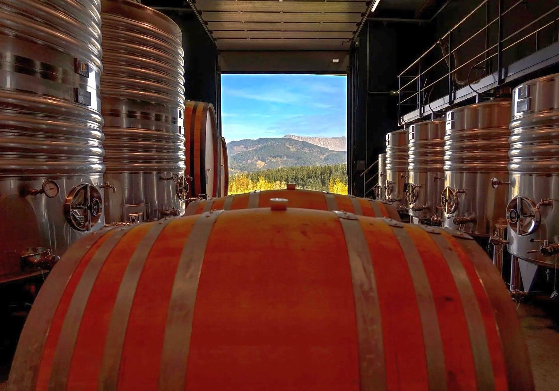 En total, cuentan con 3 hectáreas de viñedos plantados en suaves pendientes orientadas al sur, con vistas a un precioso paisaje formado por colinas suaves de terreno arcilloso y bien drenado. Allí cultivan uva de Hondarrabi Zuri, Riesling y Hondarrabi Beltza. Una segunda zona de viñedos de Hondarribi Beltza –con más de 100 años de antigüedad– se encuentran alrededor de la antigua bodega del caserío Basigo. Al tratarse de una bodega familiar, la elaboración del txakoli es muy personalizada y cuidada, respetando el método artesanal pero en una bodega de nueva construcción, diseñada para sacar el máximo a su capacidad, en torno a los 20.000 litros que se reparten entre sus referencias de blanco, rosado y tinto.