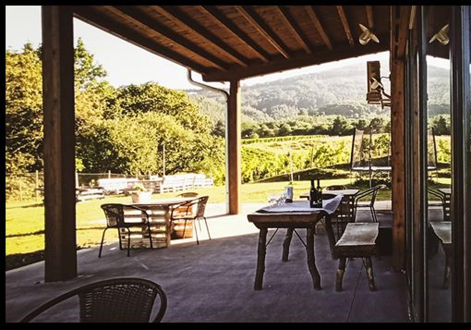 Después de la visita, si la climatología acompaña, podrás disfrutar de la gran terraza situada bajo el alero del tejado y con vistas al monte y los viñedos. Allí pueden degustarse sus txakolis, junto a otras delicias culinarias.