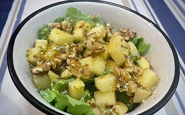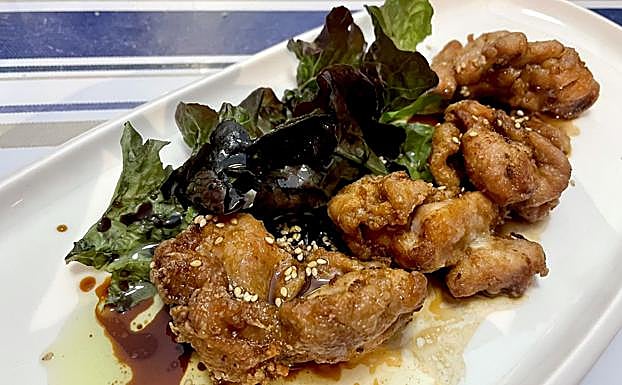 Pasan las tres de la tarde y, como anunciaba mi amigo, el comedor está a reventar. Me acomodan en una mesita de la planta baja, al lado de la caja registradora. A estas alturas el público ha dado ya con buena parte de las existencias, así que Jesús canta «lo que le queda». Pido ensalada Waldorf y pollo frito al estilo Karaage, pero me quedo con las ganas de probar su timbal de verduras o su afamada lasagna.