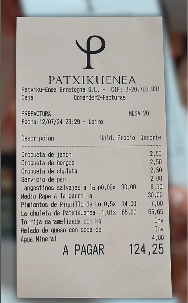 Cabezali también degustó otras recetas de la carta como las croquetas de jamón, langostinos y el rape a la parrilla. Le rechifló. «El rape me gusta, me gusta el punto que le han dejado al pescado. Cuanto más lo pruebo, más me está gustando», apunta mientras rebaña el plato. La cuenta ascendió a 124,25 euros. Pablo da su valoración final y señala que se trata de «una comida que perfectamente da para dos. Me ha encantado. Me ha gustado bastante todo, pero los postres han flojeado un pelín, salvo la torrija». Con todo, se reafirma en su pasión por la gastronomía vasca: «Amo el norte de España, qué bien se come en Euskadi, Galicia, Asturias...», zanja.