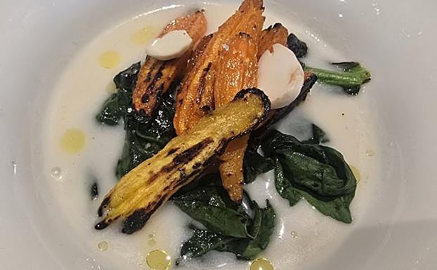 Las verduras impresionan por su verdad. Zanahorias, espinacas, hongos: el carbón de encina les otorga un alma primitiva. Tan purista como el txipiron con caldo de cebolla. El plato de ventresca de bonito con salsa de pimiento Apurtuarte rompe toda línea ascética. Es intenso, casi barroco. El pimiento, confitado y ahumado, se vuelve una salsa de rojo profundo que invita a mojar pan sin remordimientos. Es un momento de emoción, uno de esos que justifican el viaje.