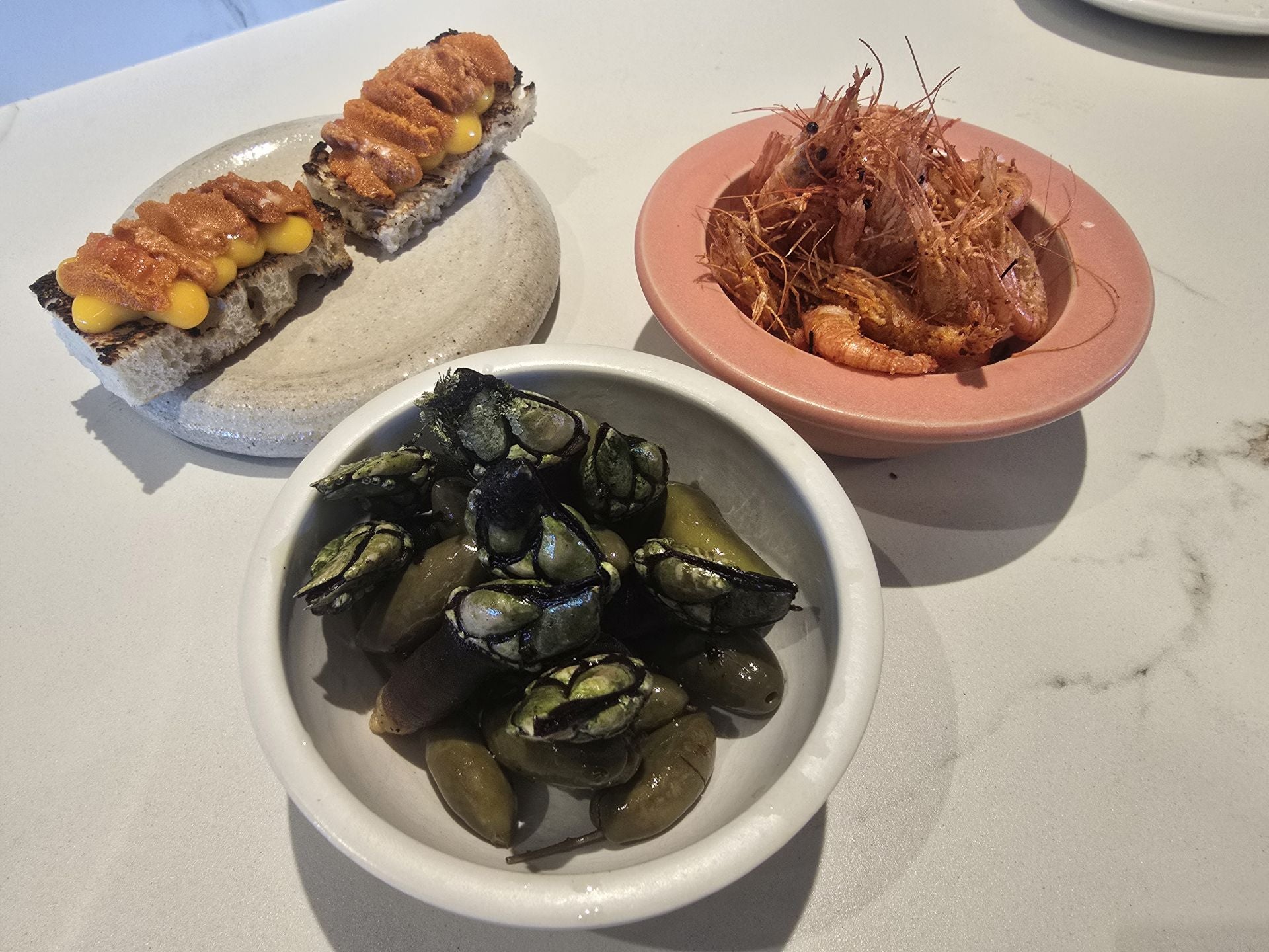 El pan a la brasa llega hinchado y vivo, con un repertorio de patés de berenjenas con notas ahumadas, espinacas con yogur y zanahorias con comino. Es un inicio prometedor, una especie de declaración de principios: aquí todo pasa por el calor. Luego todo ocurre con un ritmo casi narrativo. Cada plato parece un capítulo breve que se escribe con humo. Una gilda canónica, un tomate con tomatada que sabe a tomate (cosa rara en estos tiempos de impostores rojos), unas anchoas marinadas con limón y garum. El camarón frito, los percebes con aceitunas, la tosta de erizo y yema,.. Un desfile en el que se percibe cierta contención, una voluntad de pureza que puede rozar la frialdad. Como si el fuego, domesticado por la técnica, perdiera un poco de su salvajismo original.