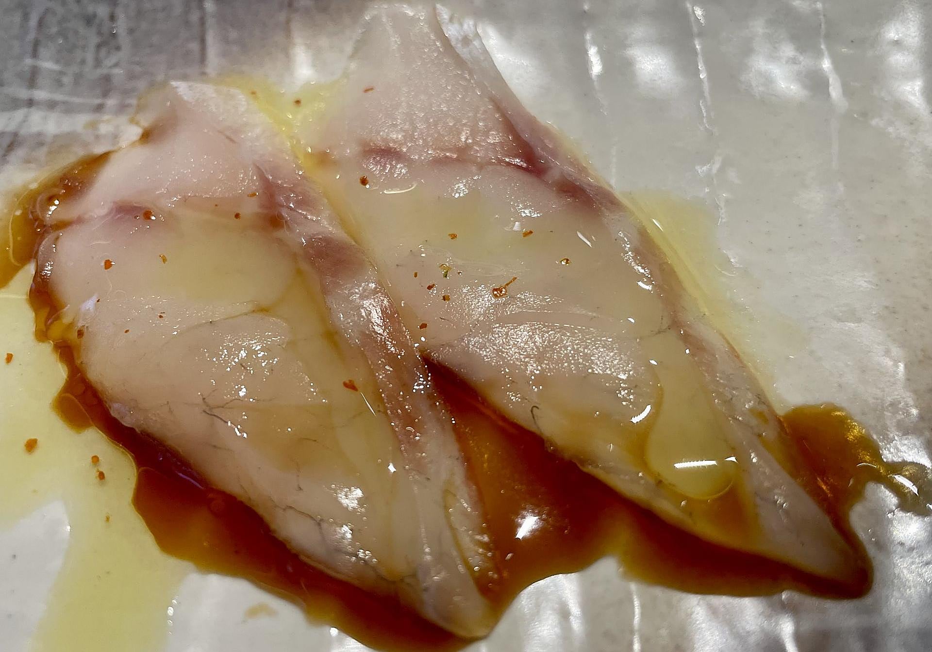 El sabroso sashimi de lubina a la bilbaína que Dani Lomana prepara en la barra de clara madera de nogal de Okendo es un resumen certero de la doctrina mestiza que alumbra los gestos de este sushimen vasco. La primera vez que Lomana cenó en el Kabuki de Ricardo Sanz quedó deslumbrado por aquella fusión y dedicó los días siguientes a despiezar y cortar peces con el deseo de vincular Euskadi y Japón. Lo primero que le vino a la mente a alguien que, con cuatro años, jugaba a asar sardinas con Mariano en el Mandanga de Santurtzi, fue la salsa bilbaína. A los años, cuando volvió a Kabuki para hacer prácticas, descubrió que su idea ya brillaba en un plato. Hoy, ofrece una versión muy delicada de la salsa madre, a la que ha despojado de los invasivos chips de ajo y niquela con un simple aceite de ajo, vinagre de arroz y shichimi togarashi (salsa de los siete sabores) que visten de satén a la grasa y blanca lubina. Los cortes son soberbios, precisos y fieles a la técnica usuzuruki.