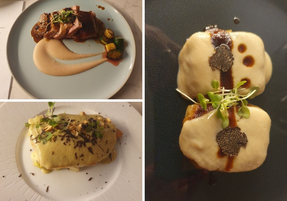 El cocinero Markel Ramiro, primera generación graduada en Gastronomía y Artes Culinarias en el Basque Culinary Center, formación que completó trabajando con chefs como los hermanos Adrià, Gorka Txapartegi, Richard Toix en Francia y asesorado en Mahasti por Juan Carlos Ferrando, diseñó un menú que recorría los aromas de la trufa y el vino. Así llegaron a la mesa jugosos Ravioli de champiñón de foie gras, salsa de cebolla dulce caramelizada y trufa fresca rallada, en compañía del vino blanco Jardin d'Eden 2017 (Grenache, Roussanne), una armonía delicada. La Lubina en salsa de cava y trufas se maridó con el tinto L'Imprévue 2021 (Grenache noir). La Presa de Cerdo Ibérico en salsa Périgueux, mini legumbres y crema de castañas llegaron con el Syrah Légendes 2012 en magnum. El fantástico Queso trufado de casa Benat en San Juan de Luz se armonizó con el blanco Jardin des Légendes 2022 (Viognier). El Flan a la trufa y helado de chocolate blanco se sirvió con el tinto Muses 2017 (Grenache Noir, Mourvèdre).