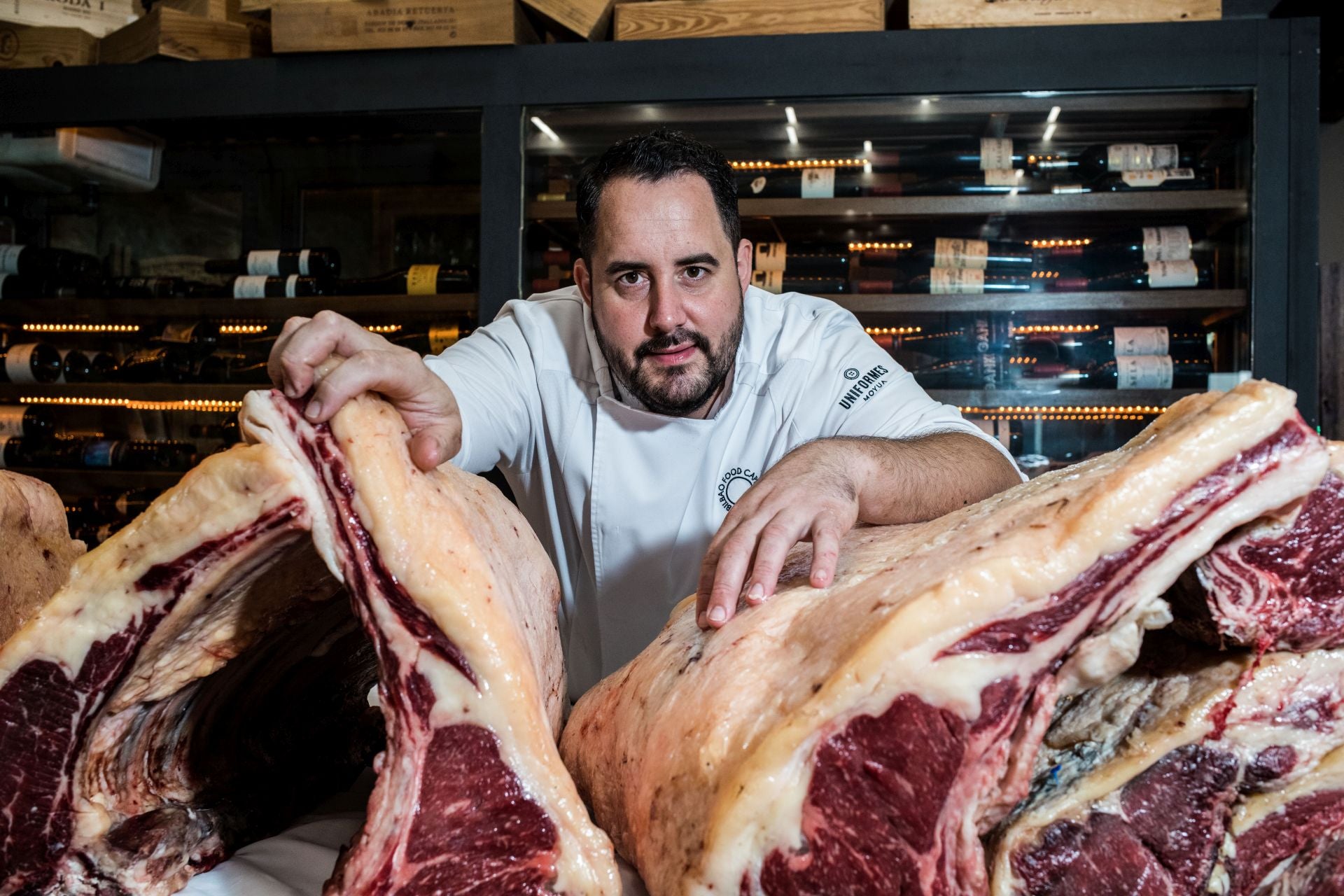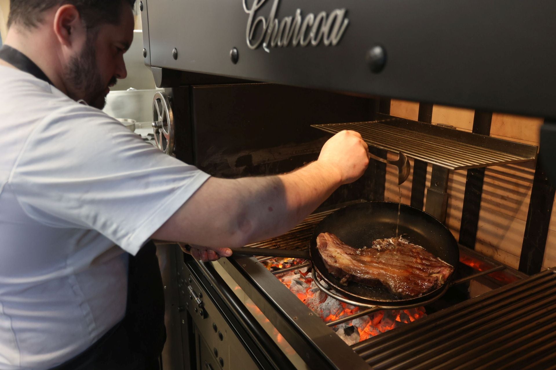 En cuanto a la preparación de la tan deseada chuleta, muchos pensarán que Llamosas usa parrilla o plancha, pero no. El cocinero pasa cada pieza por una enorme sartén de hierro muy, muy caliente y baña la carne con su propia grasa derretida, con paciencia y un cucharón. Y así la sirve a la mesa. En cuanto a la elección de los platos de las Jornadas de buey, hay algunos que nunca cambian, como el tartar con tuétano, el consomé al Armagnac, la croqueta de guiso de buey o la chuleta. «Cada vez que hemos tratado de retirarlos, los clientes nos los han exigido de vuelta».