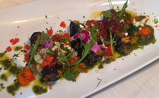 El condumio comienza con dos delicatessen, productos de El Capricho, cecina de buey con almendras y chorizo de buey picante. Para continuar ofrecen canelón de atún rojo con jugo de olivas verdes, piparras y albahaca, cuya base es maíz dulce, reducción de piquillo y perlas de wasabi. También, aguacate a la parrilla con queso de cabra y pesto de cilantro o sándwich de pastrami con salsa tártara.