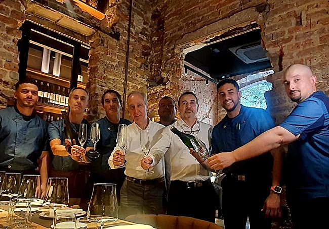 En el Brasadero le dan mucha importancia al equipo. Gran parte de quienes trabajan en el local llevan varios años desarrollando sus funciones en algunos otros locales del grupo Bilbao Berria. En la foto, Iñaki Lasa, cabeza visible del proyecto e hijo de Dioni Lasa –uno de los grandes nombres de la cocina vizcaína– posa junto a José Antonio Ramos, jefe de sala de los locales; Aitor Elola, chef ejecutivo del grupo, y parte de los integrantes del equipo: Mohamed Kalach, Juan Antonio Casanova, Alberto Samaniego, Carlos Contreras y Jon Ander Miró.