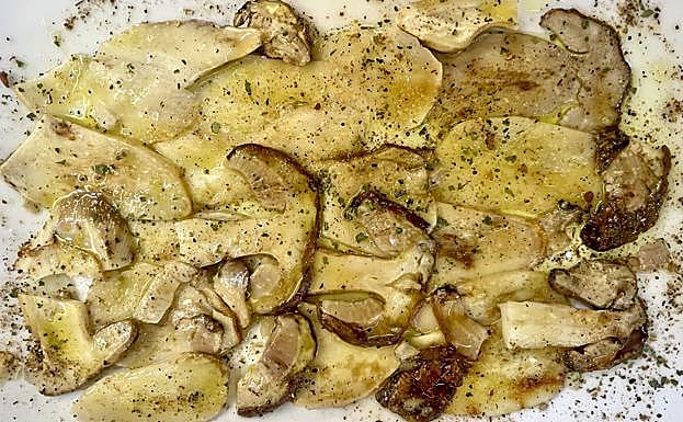 Siguió con un tartar de vieira y bogavante con wakame y mahonesa de algas. Los toques orientales son recurrentes pero medidos, sin perder de vista el objetivo principal: realzar las virtudes de productos crudos o apenas elaborados. Este sí es un fijo de la carta. Después, unos soberbios boletus en carpaccio, cocinados solo con un golpe de horno y realzados con polvo de hongo seco elaborado por ellos mismos. Una gran bienvenida a una temporada micológica que se anuncia pródiga. Y remató el menú con un derroche de bilbaína: kokotxas de bacalao al pilpil coronadas por tiras de pimiento rojo asado de Tormantos. Una receta para convencer a los que, al entrar por la puerta, dudaron quizá de este híbrido entre restaurante y tienda de ultramarinos.