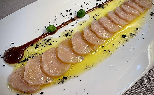 A partir de ahí es Luiscar quien le saca jugo a un producto sobre el que en Mugarra no se admiten concesiones. A veces desnudo, otras vestido de traje regional, la mayoría con un atuendo japonés que sienta como un guante a los pescados y mariscos del Cantábrico que componen el grueso de su despensa. El menú confeccionado con Carlos aprovecha un poco de todo, empezando por un sashimi de bonito con confitura de miso y perlas de wasabi. Carne blanca, corte pulcro, textura finísima –domesticada por congelación– y aderezos que suman. Un fuera de carta que me alegro de haber aceptado.