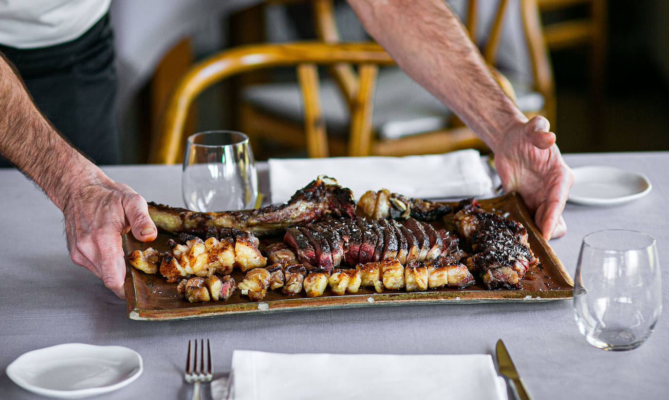 La joya de la corona es la chuleta de vaca a la brasa, trinchada como en ninguna parte, que ofrecen en distintas maduraciones. Una corta de treinta días para la gente normal y otra que guardan el doble de tiempo, para los más cursis con ganas de fardar que luego cuentan la experiencia 'premium' en el trabajo o a su cuadrilla o en la cena de cuñados. Todas servidas con patatas fritas, lechuga y cebolleta o pimientos rojos del piquillo. Cómanse la grasa bien torrada y dejen mondos los huesos, apurando con el filo del cuchillo. De postre, frutos rojos con granizado y helado de yogur, soufflé de chocolate con helado de avellana, gloriosa tarta al whisky 2.0 y un carro imponente de quesos seleccionados. Disfruten, que nos quedan dos telediarios.