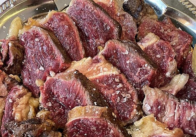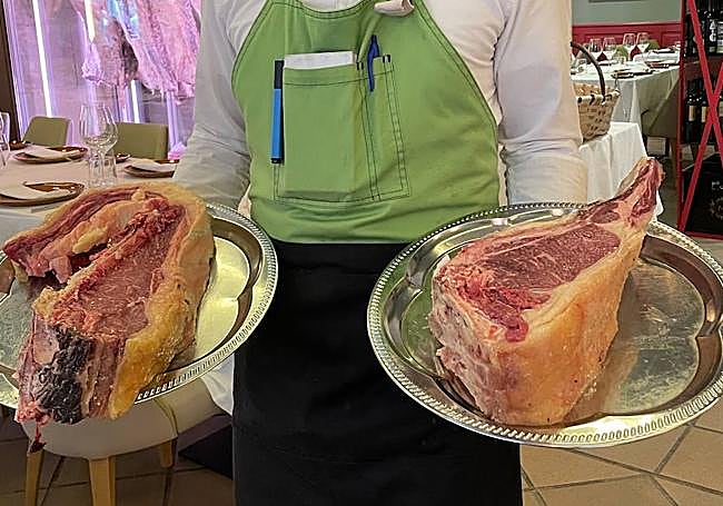 Escogemos una pieza de 2,1 kilos de Rubia Gallega Minhota (redundancia) a 80 €/k. Y, otra de 2,4 kilos de buey madurado, que nos son presentadas en sendas fuentes por Víctor Castañeda. Son enormes, de unos 10 centímetros de grosor, con un hueso proporcional que proponemos tratar (sin éxito) e infiltración media. El buey tiene un intensísimo color rojo oscuro.